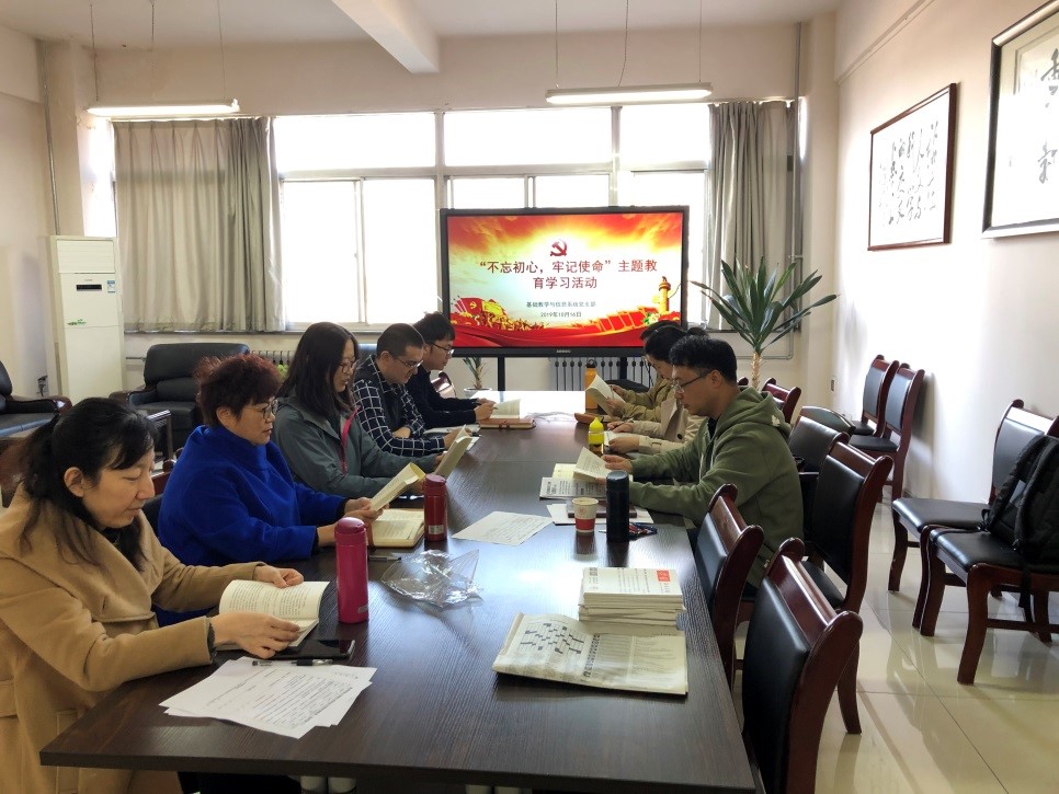 2019年11月6日下午,龙8在线登录官网-龙8(中国)基础教学与信息系统党支部在学院四楼讨论室开展“不忘初心、牢记使命”第四次主题教育活动。全体在校支部党员老师参加了此次学习活动。会议由支部书记黄昭老师主持。