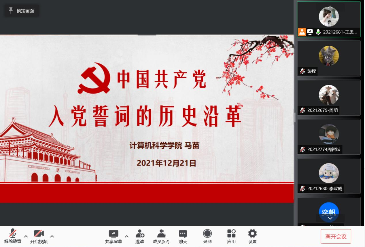 为深入学习贯彻习近平新时代中国特色社会主义思想和党的十九届六中全会精神,2021年12月21日晚7点半,联系学生第四党支部的副院长马苗老师以《中国共产党:入党誓词的历史沿革》为题,在线上为支部开展了一堂生动的党课。党课由学生第四党支部书记王思言主持,支部全体党员参加。